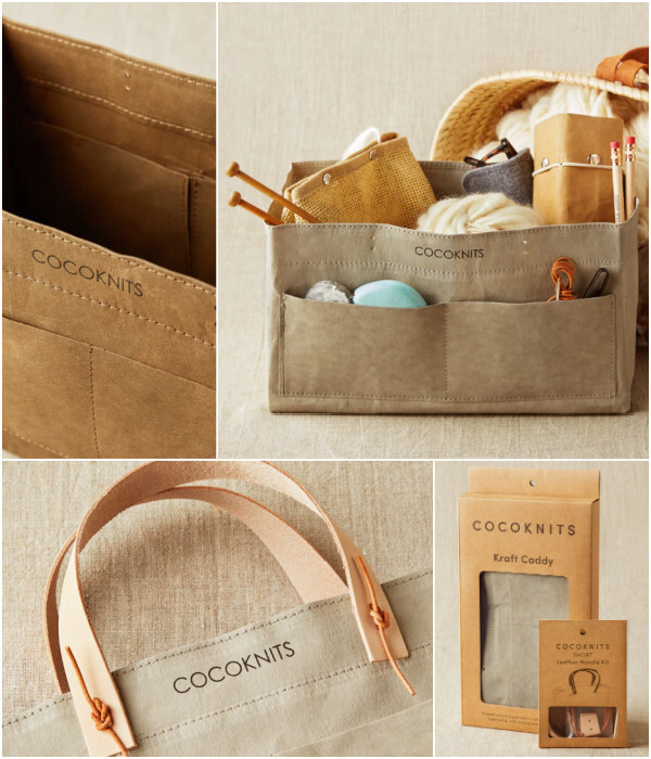 Kraft Caddy was designed with as many pockets as possible, and according to Julie, you can never have too many! The center is wide open for bigger items like knitting projects, lunch and a water bottle, a rolled-up sweater for travel - and the whole thing fits right down inside the tote. Keep it on a shelf or a desk as a storage bin without handles, or add the short, wide leather handles (sold separately) so you can grab it for travel.
