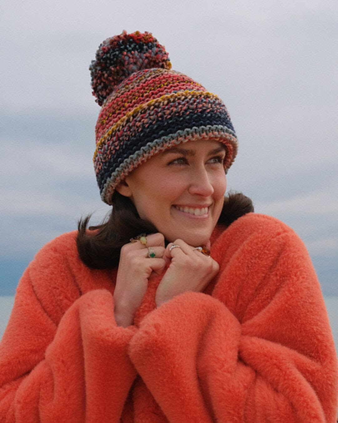 The Double Plump Hat is a 1x1 ribbed hat that features an extra large, double brim that’s folded over twice. This bulky weight pattern uses double knitting, a technique that allows us to create a natural fold in our work. This results in a folded brim that’ll always stay in place, making this hassle free hat super easy to style and wear. You can find the pattern here.