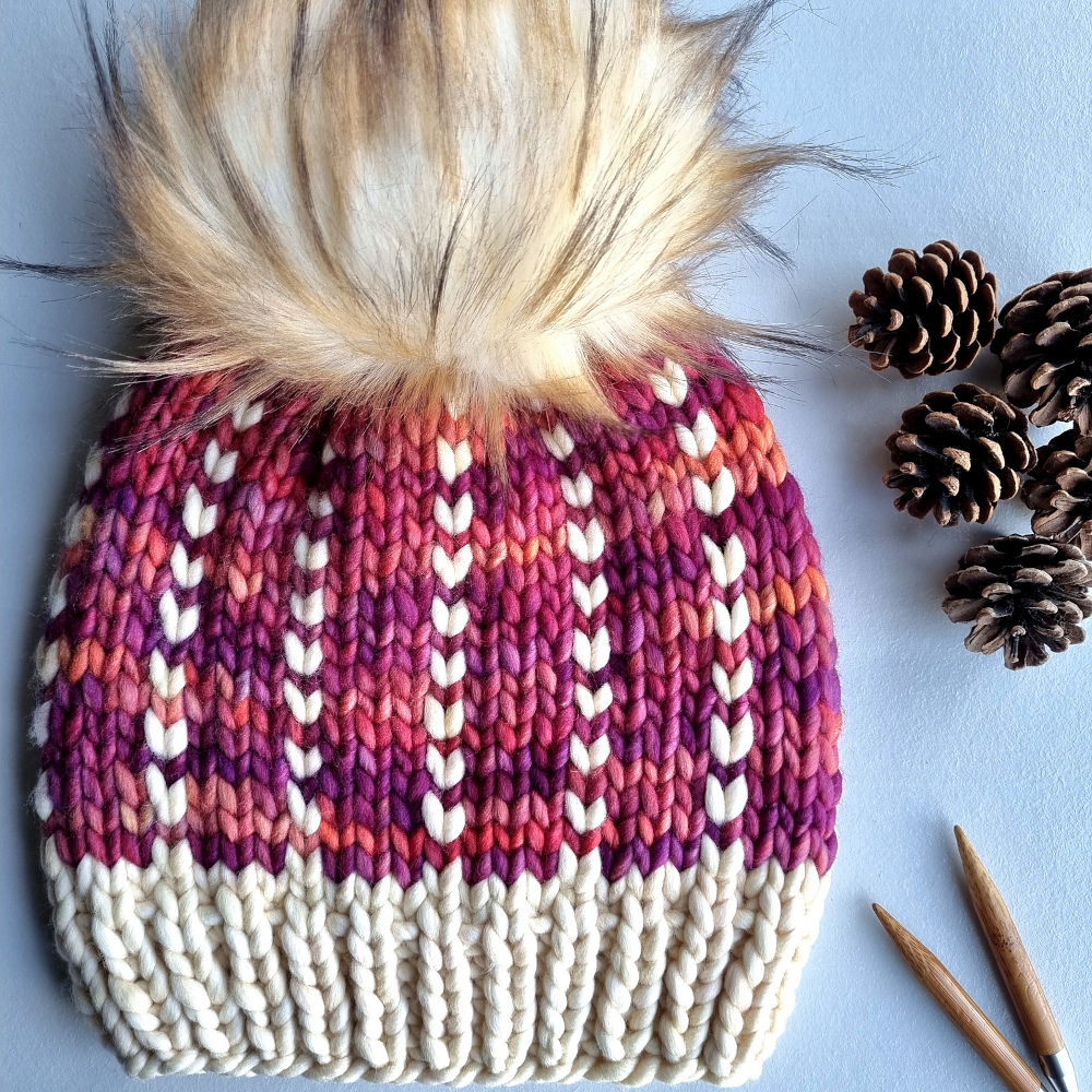 To knit the True Love Beanie, you'll need 2 colors of Rasta - and we currently have OVER 60 colors in stock (yes, you read that right!). We also recommend grabbing a KFI Furreal Pom Pom to finish off the top of your hat.