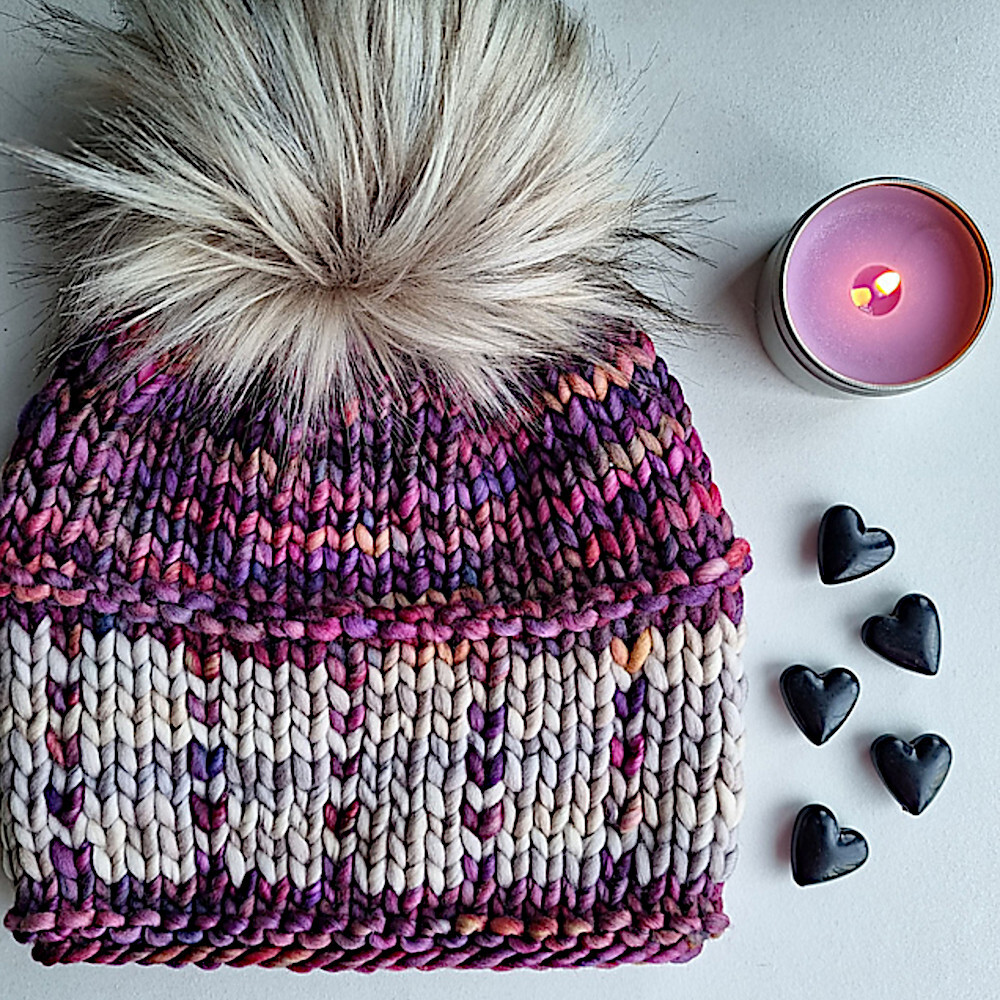 The True Love Beanie designed by Kristel Nieves is a fun, fast knit, and happens to be great for a first colorwork project. It’s written for five yarn weights (featured here in Super Bulky Rasta), and offers endless color combination possibilities.