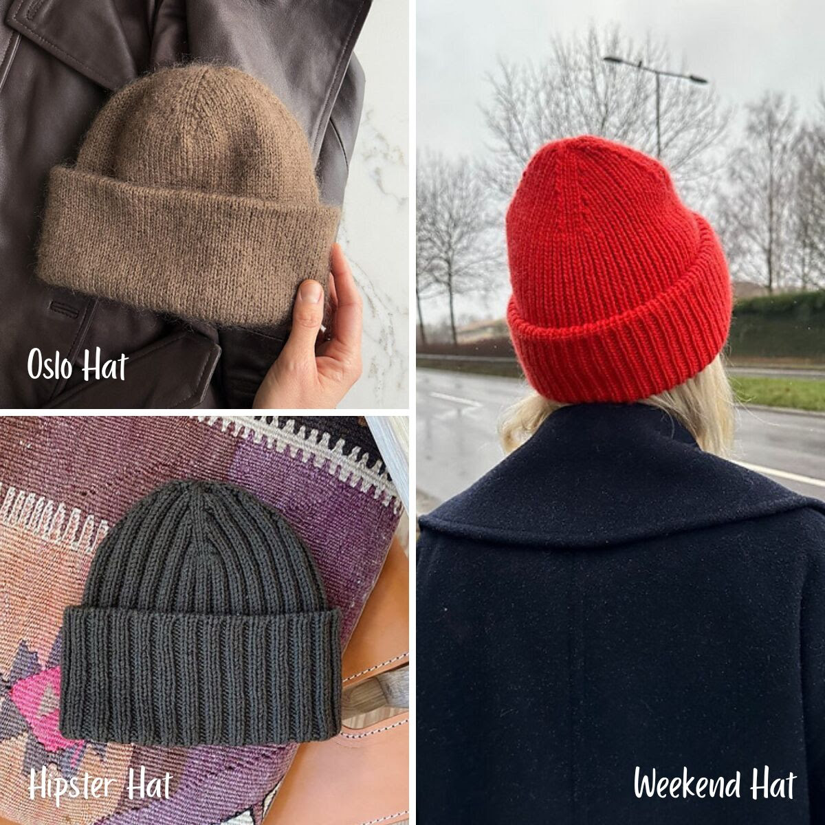Lets talk about beanies first. Winter is the prime time to embrace these stylish and oh-so-functional accessories. Not only do the keep you cozy on a chilly day, beanies are also a great way to add a little pop of color to any outfit. We couldn't pick just one of PetiteKnit's hat patterns... so we picked three! Clockwise from the top left you'll find the Oslo Hat, the Weekend Hat, and the Hipster Hat.