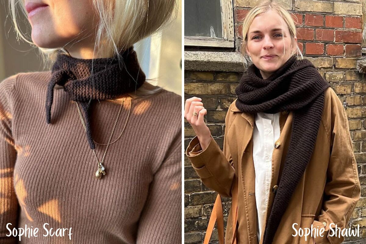 Easily the most iconic accessory in the PetiteKnit collection is the Sophie Scarf (featured above, left). This versatile little scarf has a whopping 44,000 projects logged on Ravelry, and we're here to confirm that once you've knit one, you can't live without it! If you prefer a more substantial piece, then you'll want to knit the Sophie Shawl instead (featured above, right).