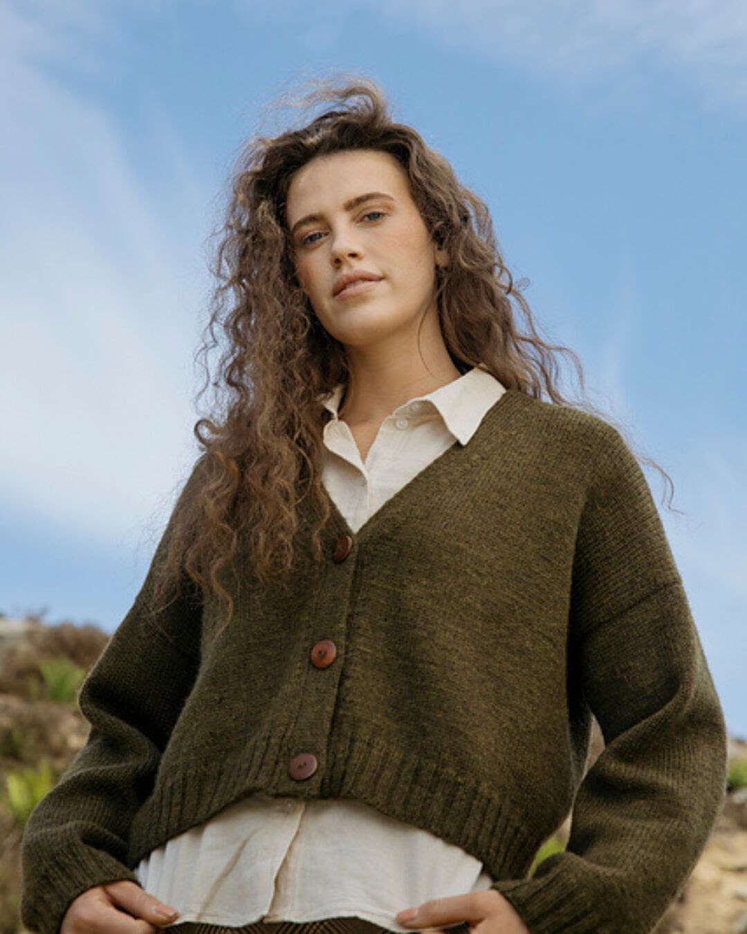 Jonna said the starting point for this design was the yarn itself: the new Laine x Novita DK. Its beautiful drape and tactile feel allow the simplest stockinette stitch to shine without the need for extra embellishments. The color is something special too: a soft blend of moss and olive green that captures everything we love about nature, from the quiet richness of a forest floor to the muted elegance of Mediterranean landscapes.