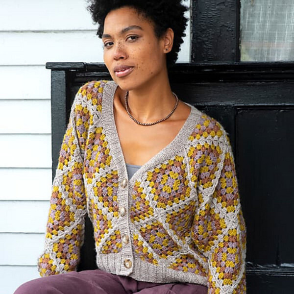 | If you've been contemplating knitting your first sweater, we can't recommend the Tin Can Knits Flax Worsted enough! This top down, in the round pullover was designed as a "first sweater" project, and has in-depth instructions and helpful tutorials that are sure to set you up for success. | The Ariana sweater by Amy Christoffers turns the typical granny square cardigan on its side. This crochet cardigan’s unique construction is finished off with knit button bands and cuffs. While originally designed in Berroco Lanas, you can use Vintage instead as a machine washable option! |